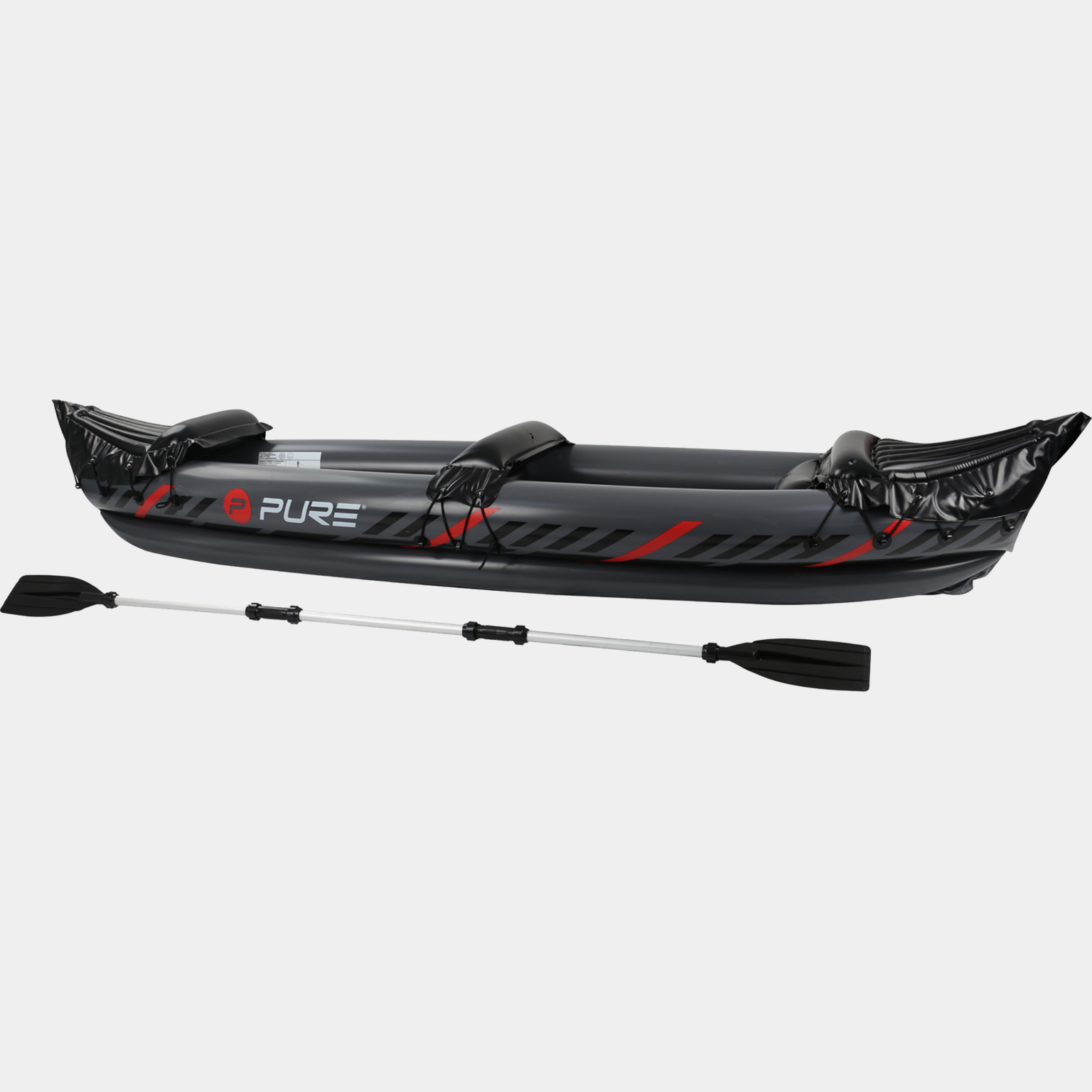 Kajakk er ideell for turer på innsjøer eller elver. Hevede seter for komfortabel padling. Egnet for 2 personer. Lett å løfte. Oppblåsbar og enkel å frakte med seg.